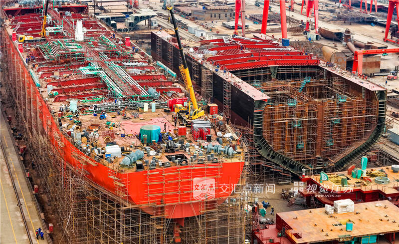 12月4日,仪征市一家船舶制制企业厂区,各类型号船舶正在建制中,一派忙碌气象。方东旭 摄 视觉江苏网供图。