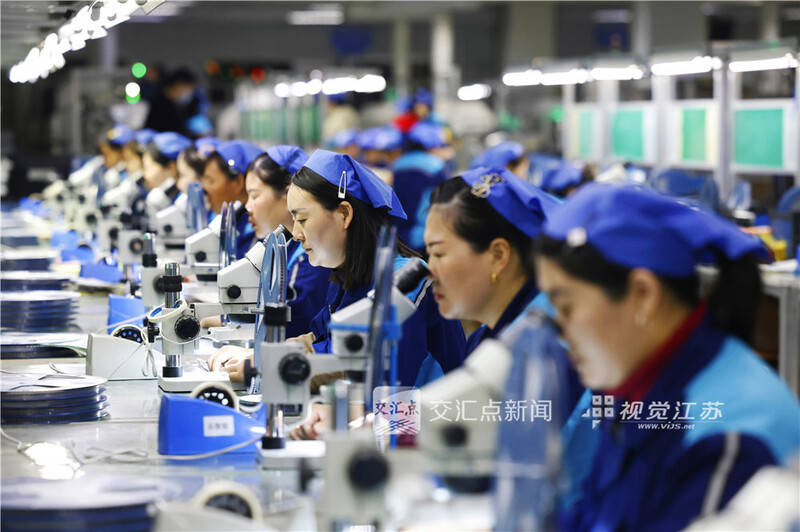 12月10日,位于泗洪经济开辟区的庆邦电子元器件(泗洪)无限公司出产车间,工人正正在赶制出口的电子元器件产物,确保实现全年方针使命。许昌亮 摄 视觉江苏网供图。