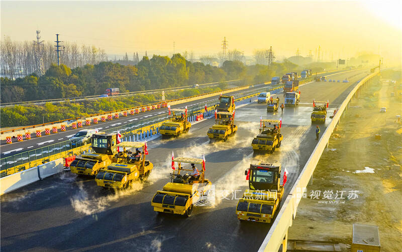 12月7日清晨,沪武高速江苏省江阴市峭岐枢纽,多台大型机械正正在摊铺沥青。当前,沪武高速南半幅改扩建工程各节点施工全面吹响“集结号”,力争岁尾实现通车。计海新 摄 视觉江苏网供图。