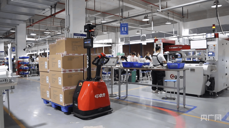 正在永州创永运品无限公司出产车间,全从动化机械臂精准高效完成裁断、刷胶等工序,工人取智能设备协同功课,各条出产线正开脚马力,加紧赶制出口订单。AGV智能搬运机械人领受指令后,自行乘坐公用电梯穿越于各楼层,按既定线将打包完成的产物从动转运至仓库,实现全程无人化高效流转。